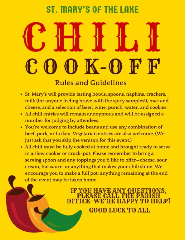 Not a chili fan? We’ve got you covered with additional food options, along with punch, beer, wine, water, and cookies. A 50/50 raffle will also be held to support our Youth Ministry.